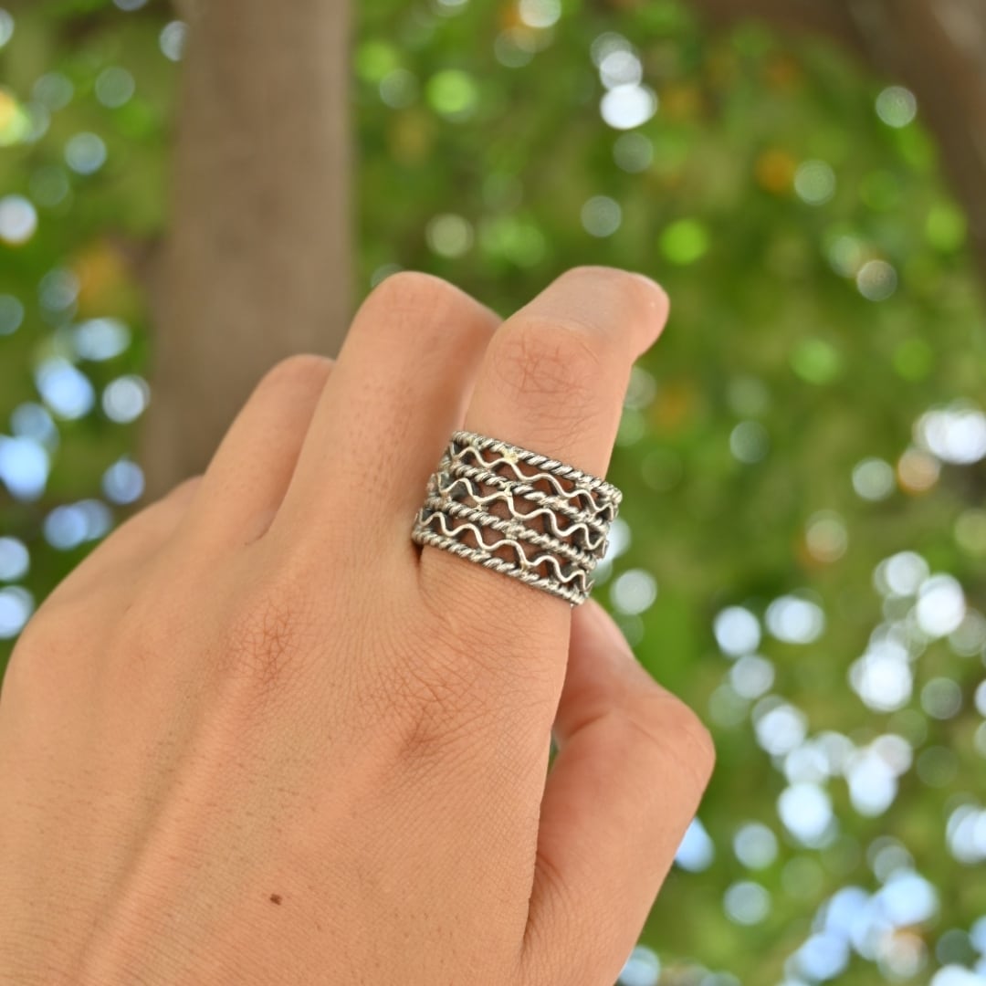 細かいうねりと透け感があり、指につけてみるとしっくりとハマるリングです。