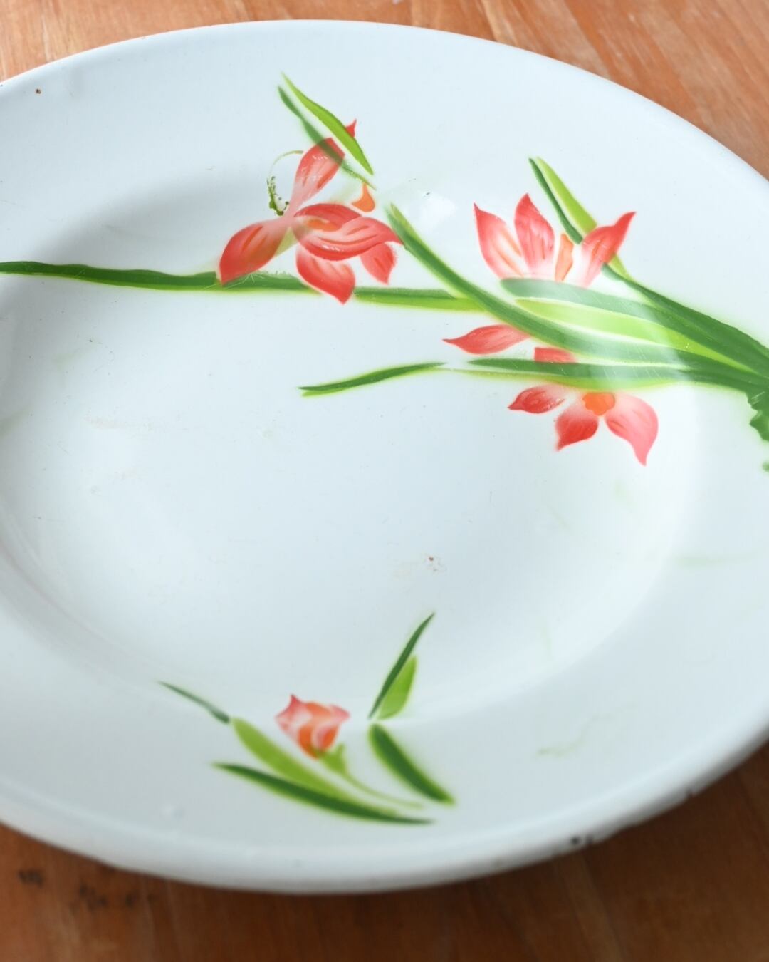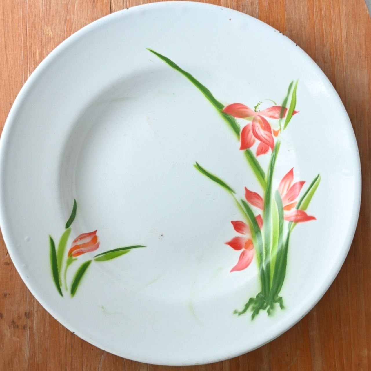タイの食卓では今も琺瑯食器が使われていますが、昔ながらの絵柄はタイでも貴重です。絵柄を触るとぷっくりとしているのも古い物の特徴です。